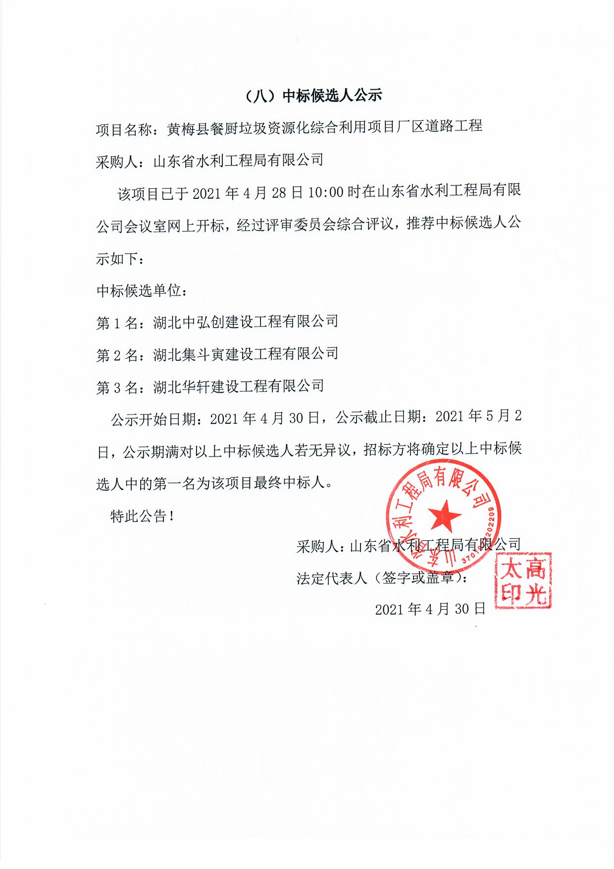 黃梅縣餐廚垃圾資源化綜合利用項目廠區(qū)道路工程中標(biāo)候選人公示