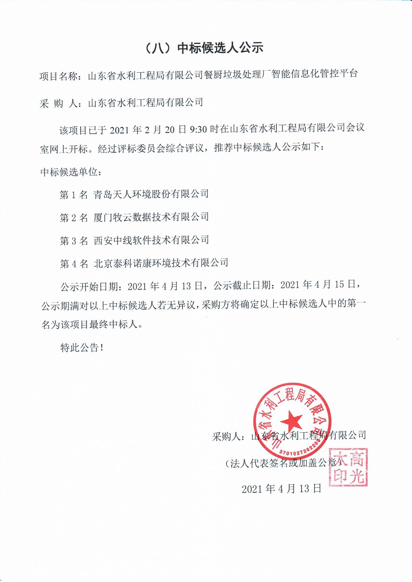 山東省水利工程局有限公司餐廚垃圾處理廠智能信息化管控平臺中標(biāo)候選人公示