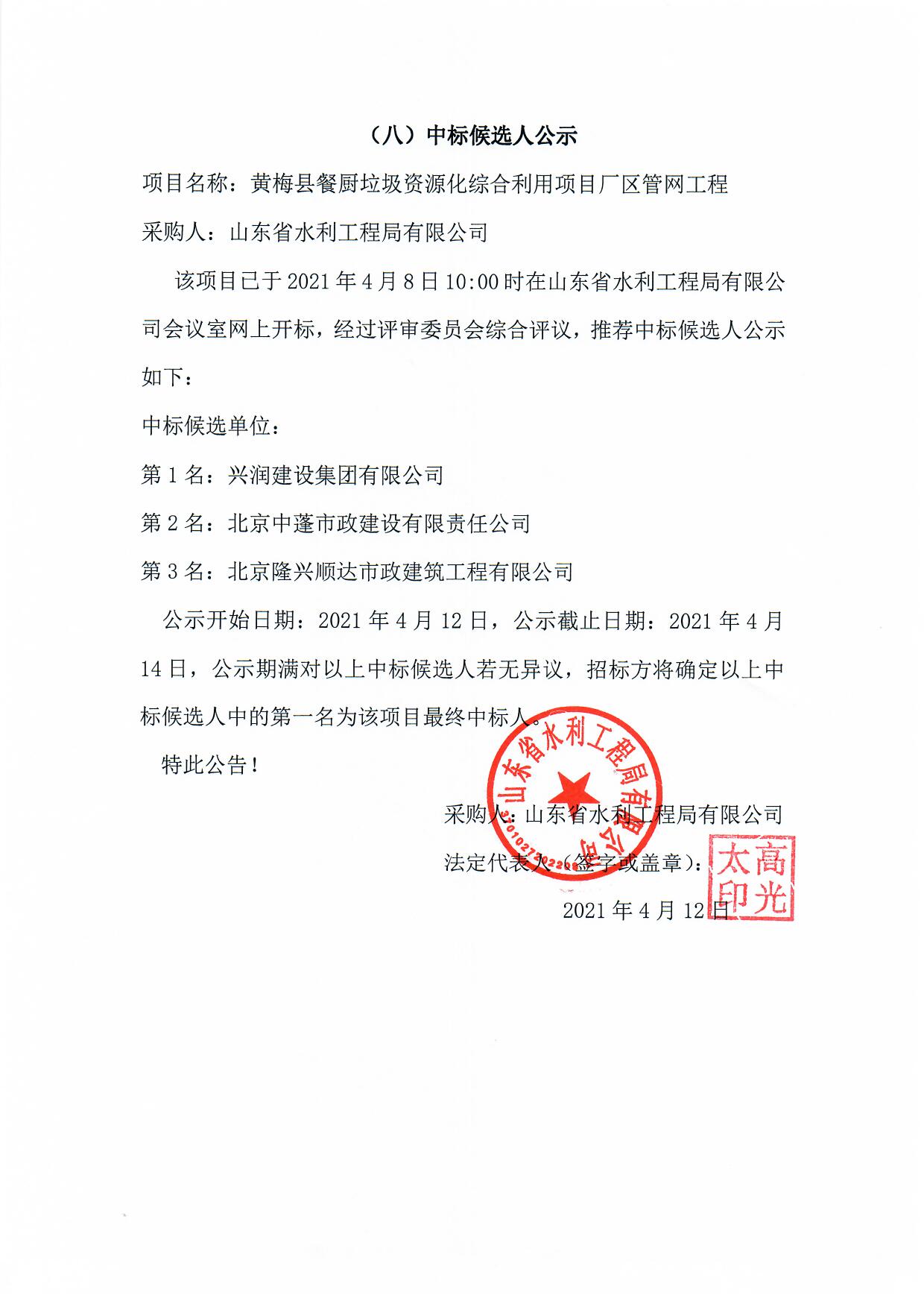 山東省水利工程局有限公司餐廚垃圾處理廠智能信息化管控平臺中標候選人公示