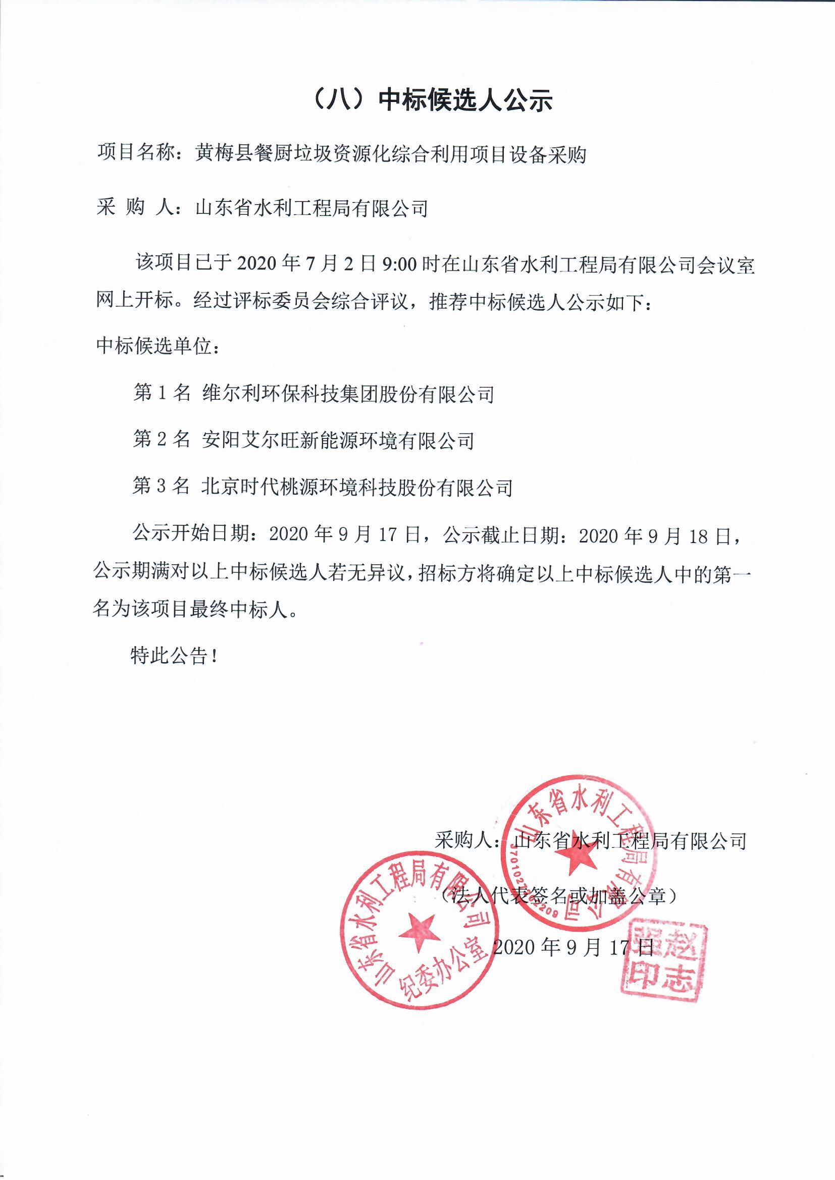 黃梅縣餐廚垃圾資源化綜合利用項(xiàng)目設(shè)備采購中標(biāo)候選人公示