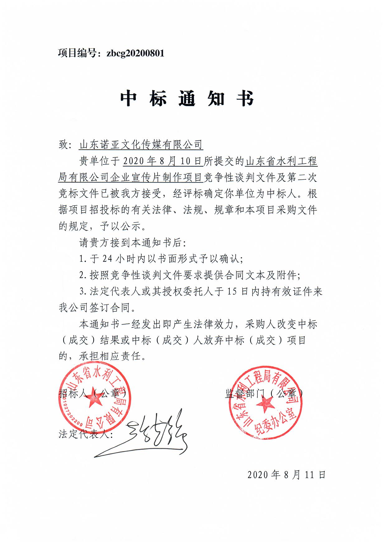 山東省水利工程局有限公司企業(yè)宣傳片制作項目中標公示