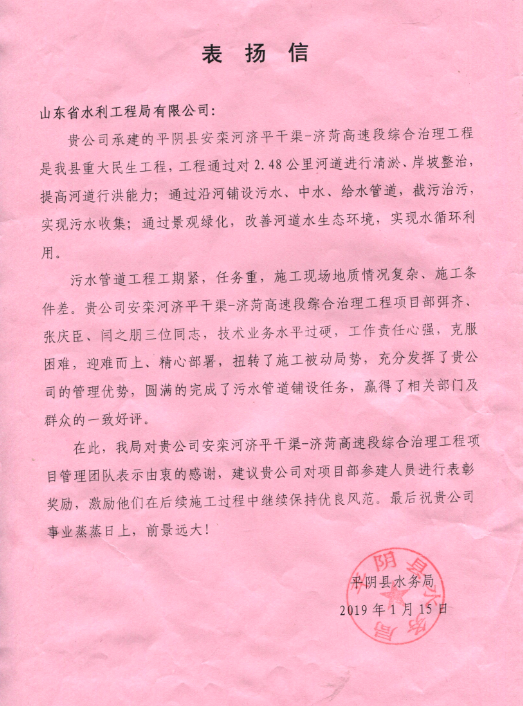 2019近日,平陰縣安欒河濟(jì)平干渠至濟(jì)菏高速段綜合治理工程三標(biāo)段項(xiàng)目經(jīng)理部收到來(lái)自平陰縣水務(wù)局的表?yè)P(yáng)信,對(duì)項(xiàng)目部2018年在安全管控、施工管理、工程進(jìn)度等方面的工作給予充分肯定,對(duì)弭齊、張慶臣、閆之朋等三位同 ...